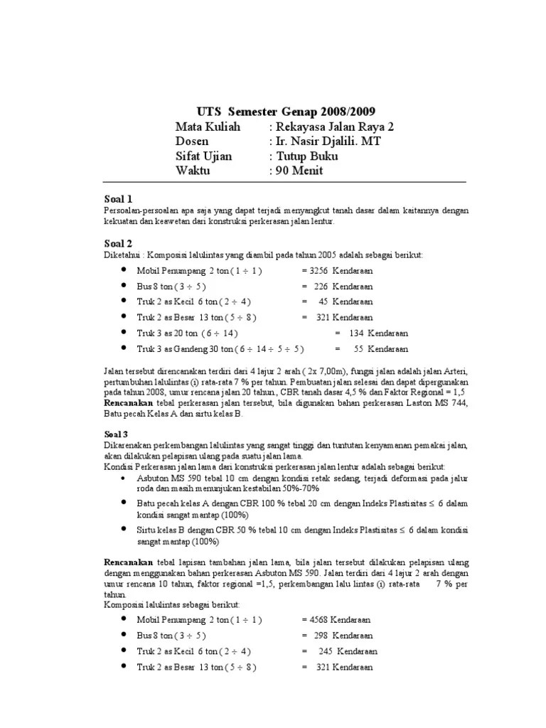 Soal Ujian Perkerasan Jalan Raya - Laporan Rancangan Perkerasan Jalan Raya I : 3 soal latihan perencanaan bina marga perencanaan perkerasan jalan baru.. Sebagai nilai ujian akhir mata kuliah perkerasan jalan raya dosen pengampu : Salah satu bahagian program pemerintah adalah pembangunan jalan raya, sehingga jalan yang dibangun dapat . Jawaban ujian kompetensi iv bersama ii tebal lapis. Doc perhitungan tebal perkerasan jalan raya menggunakan. Metode aastho1993, metode analisa komponen, perkerasan lentur.